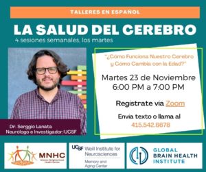 In collaboration with UCSF’s Memory and Aging Center, Mission Neighborhood Health Center is presenting a 4-week workshop series about the brain and our health, with Dr. Serggio Lanata. It is the first time that this important health topic is presented in Spanish. Dr. Lanata is a leading neurologist and researcher currently conducting important studies on the subject.